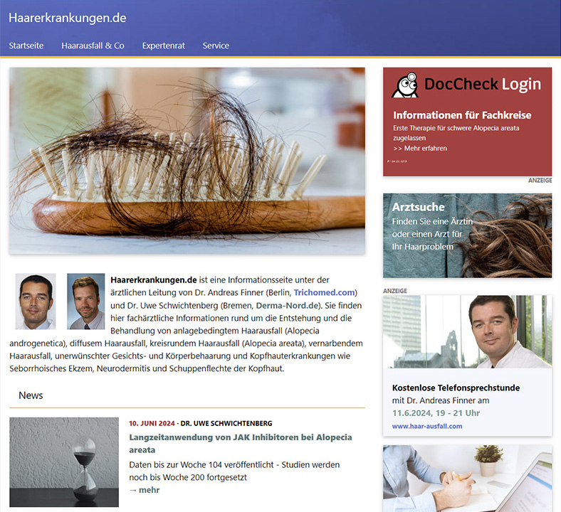 Trichologie.de ist eine Informationsseite für medizinische Fachkreise unter der ärztlichen Leitung von Dr. Andreas Finner (Berlin, Trichomed.com) und Dr. Uwe Schwichtenberg (Bremen, Derma-Nord.de).